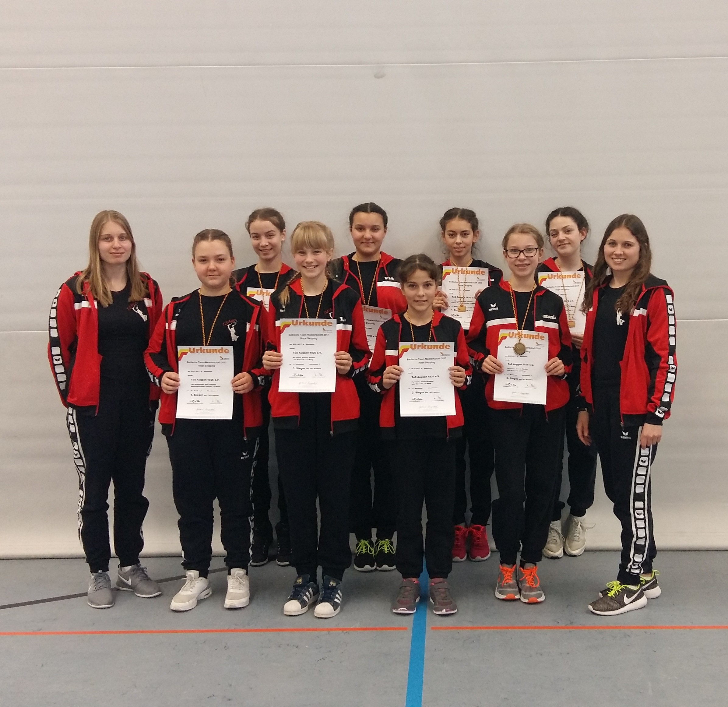 Am 29. Januar fand die Badische Teammeisterschaft im Rope Skipping in Mannheim – Seckenheim statt. Zwei Teams des TuS Auggen nahmen daran teil. Nach einer aufregenden Speed Phase mit guten Ergebnissen, mussten sich die Teams noch zwei bzw. vier Disziplinen stellen. Die Single Rope Disziplinen, bei welchen alle Springer ein eigenes Seil in der Hand haben, waren sehr synchron und beide Teams bekamen dafür viele Punkte. Bei den Double Dutch Disziplinen, bei welchen zwei Seile in die entgegengesetzte Richtung Schwingen, wurde es dann etwas schwerer. Aber auch diese Hürde meisterten beide Teams mit Bravour. Das Team mit Lara D., Liz, Sina und Sidonia ersprang sich in ihrem Wettkampf und in ihrer Altersklasse den 1. Platz. Das zweite Team mit Liv, Lara, Pia und Antonia ersprang sich in deren Wettkampf und Altersklasse mit etwas mehr Konkurrenz den 3. Platz. Für alle Springerinnen war es ein aufregender und erfolgreicher erster Team Wettkampf auf Badischer Ebene.