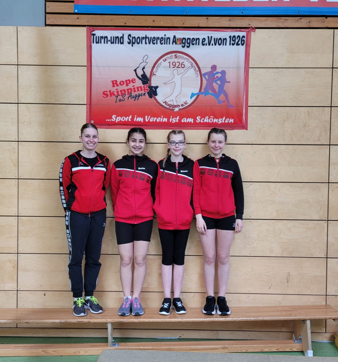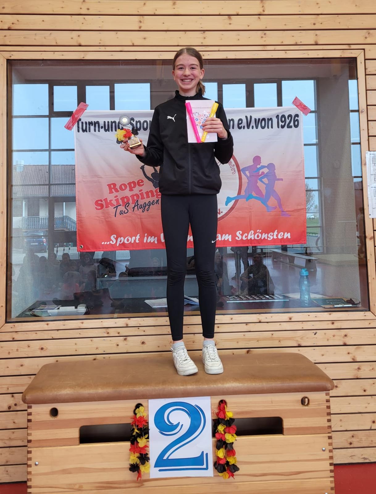 Am Wochenende vom 09. und 10. April fanden in Müllheim die Deutschen Einzel Meisterschaften (1. Liga) und das Bundesfinale (2. Liga), ausgerichtet vom TuS Auggen, statt. An der Deutschen Meisterschaft nahmen 8 Springerinnen vom TuS teil. Insgesamt starteten 154 Springer:innen an diesem Tag. Der Wettkampf startete am Morgen mit den Speed Disziplinen und danach folgten die Einzel Freestyles. Durch die zahlreichen Zuschauer:innen war eine tolle Stimmung in der Halle und es wurde gespannt zugeschaut, was die besten Springer:innen Deutschlands so drauf haben. Für die 8 Teilnehmer:innen des TuS liefen alle Disziplinen sehr gut und am Ende konnten sie sich über tolle Platzierungen freuen (siehe unten). Für die meisten war es die erste Teilnahme an einer Deutschen Meisterschaft. Besonders hervorzuheben ist die Auggener Springerin Emilia Barthelmeh, welche mit ihrer Spitzenleistung zur Deutschen Vizemeisterin in ihrer Altersklasse (AK4 12-13 Jahre) gekürt wurde.